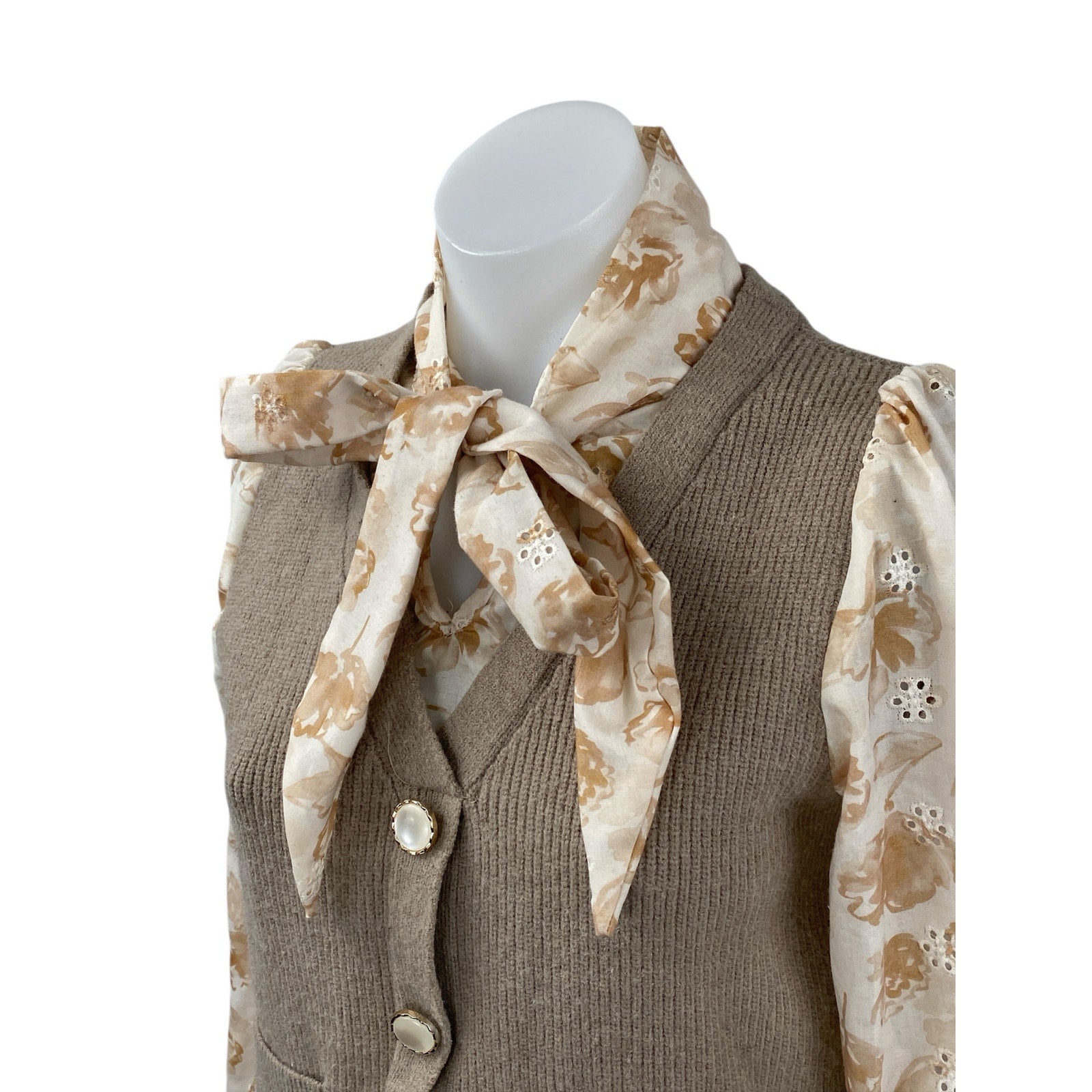 Alice Blue Brown Floral Long Sleeve Blouse Ribbed Sweater Vest Layered Top Sz M