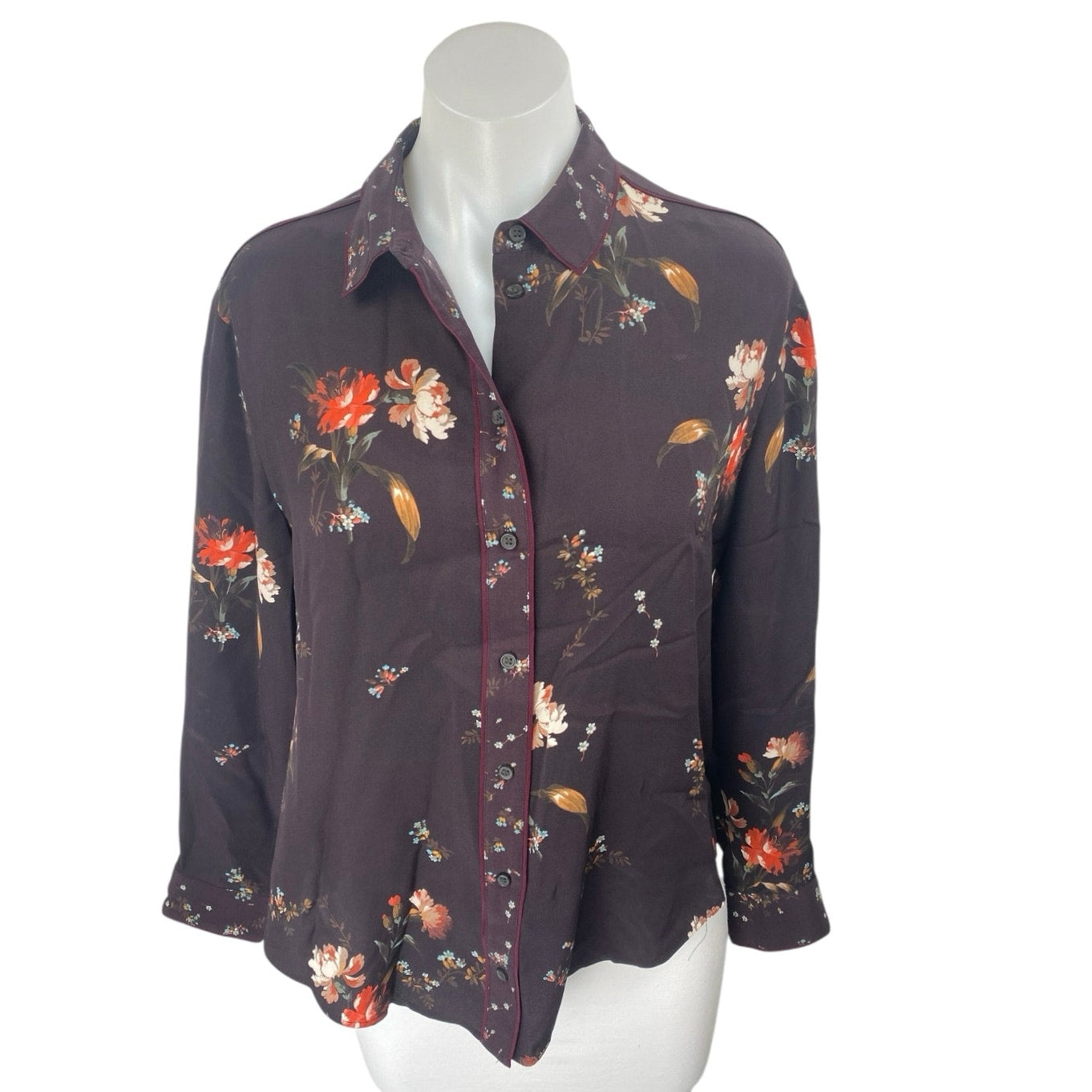 Allsaints Women's Purple Floral 100% Silk Long Sleeve Button Up Shirt Top Size 4