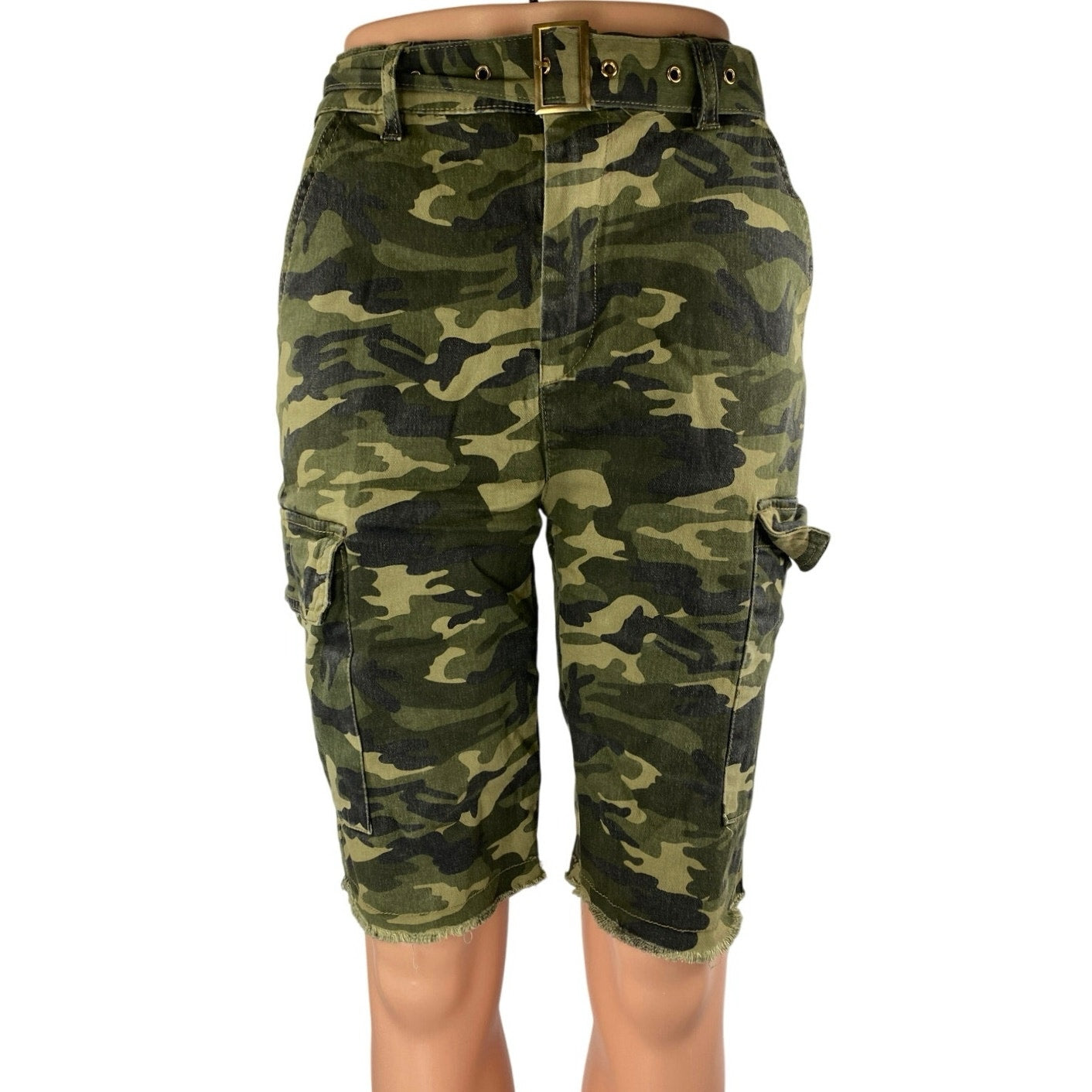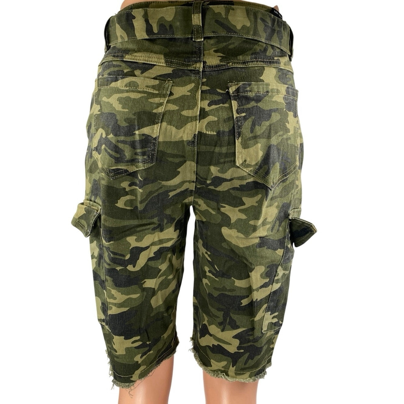 Almost Famous Women's Green Camo Camouflage Belted Skinny Bemuda Cargo Shorts 3