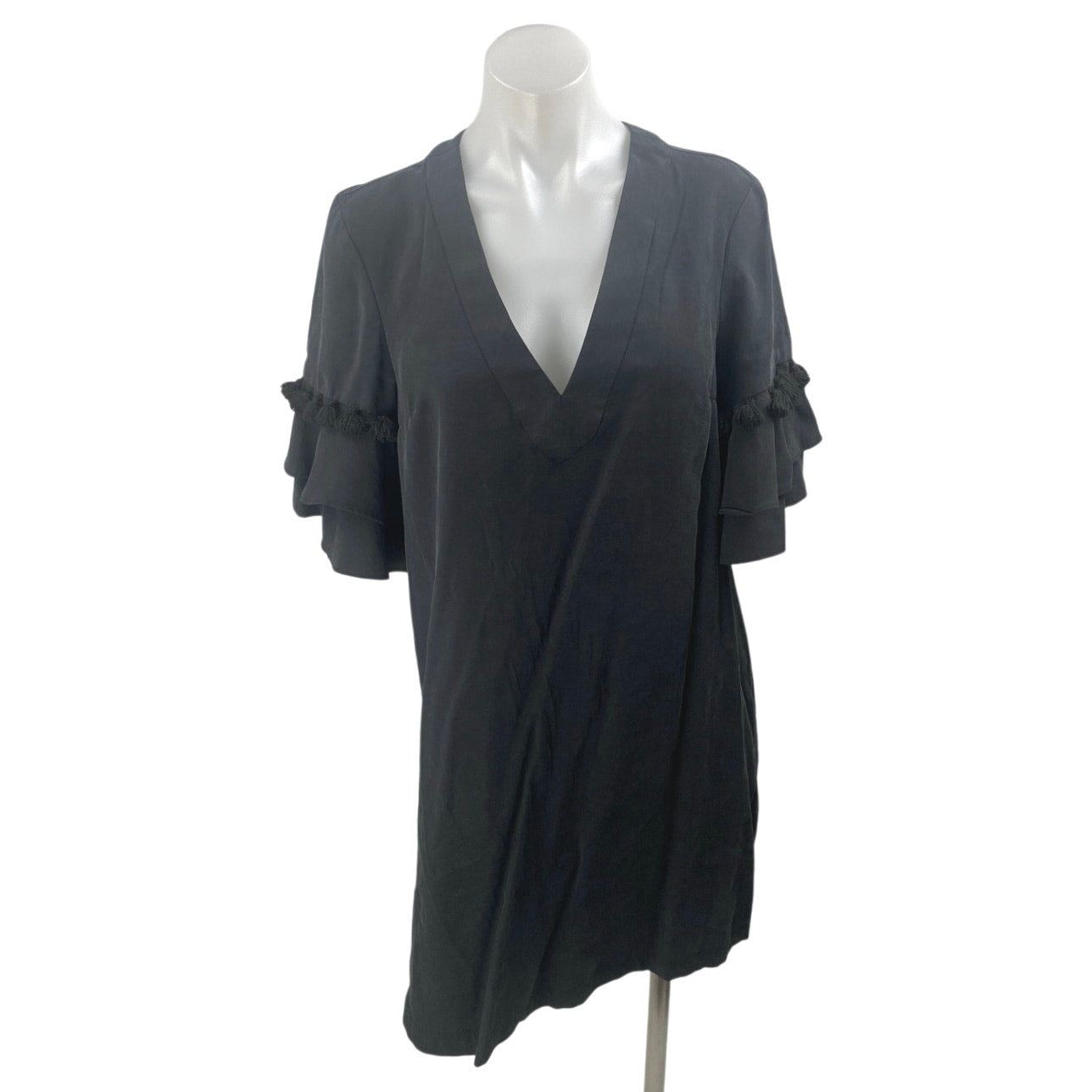 BCBGeneration Black Short Sleeve Tassel Deep V Neck Mini Shift Dress Size S