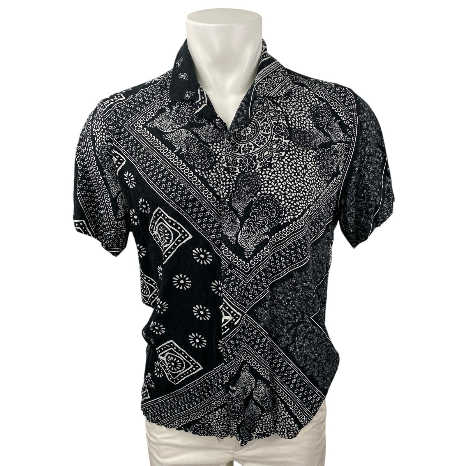 Denim & Flower Black Paisley Bandana Print Short Sleeve Button Up Shirt Top Size L