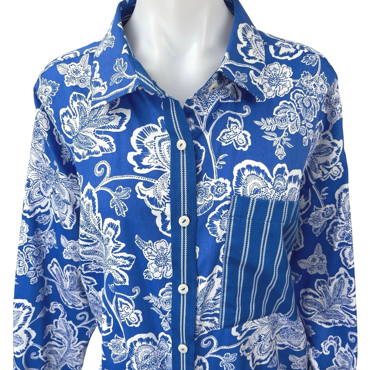 Foxcroft Marina Blue White Floral Long Sleeve Button Down Pocket Shirt Top Size 2X