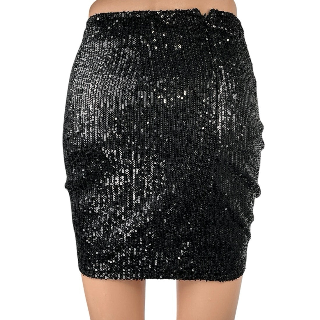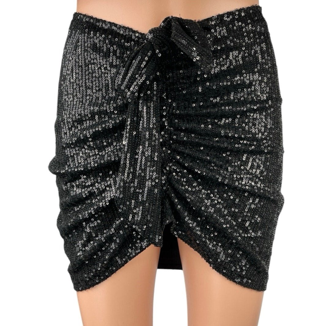 Lioness Diamonds In The Sky Black Sequin Ruched Mini Pencil Bodycon Skirt Size XS