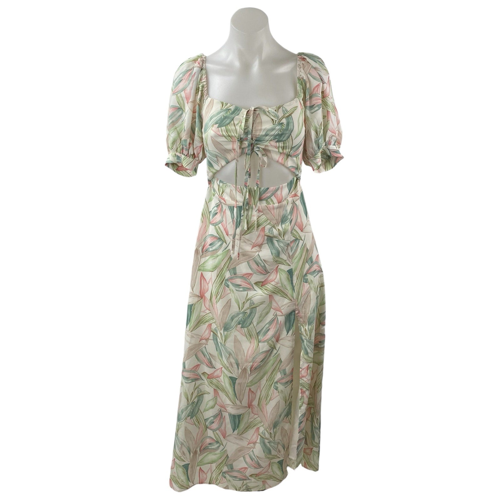 Lulus Thriving Moment Floral Cut Out Ruched Puff Sleeve Midi A-Line Dress Sz XS