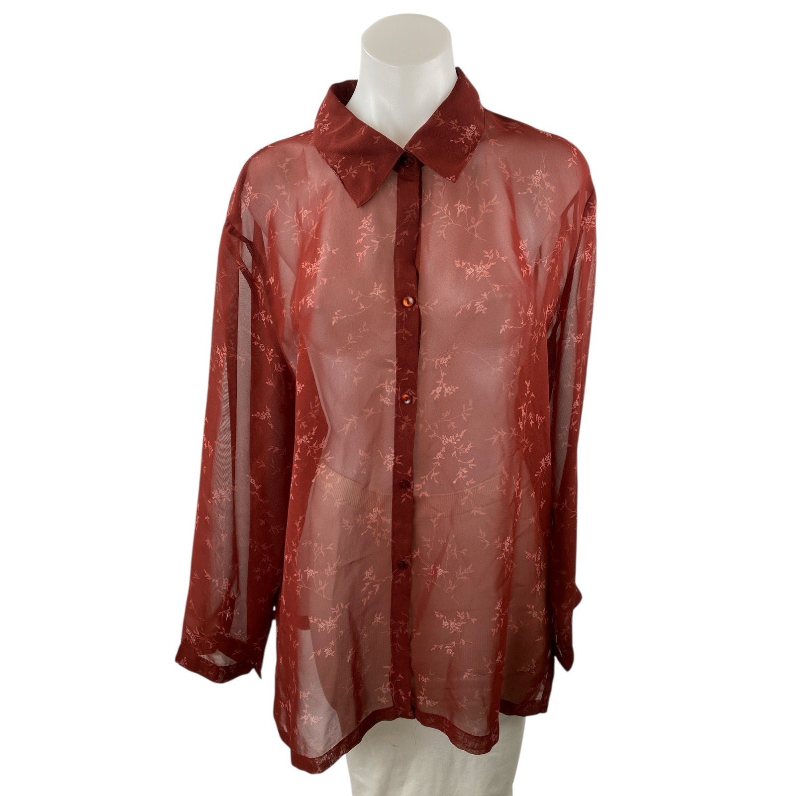 Maggie McNaughton Red Sheer Floral Collared Long Sleeve Button Down Shirt Top L