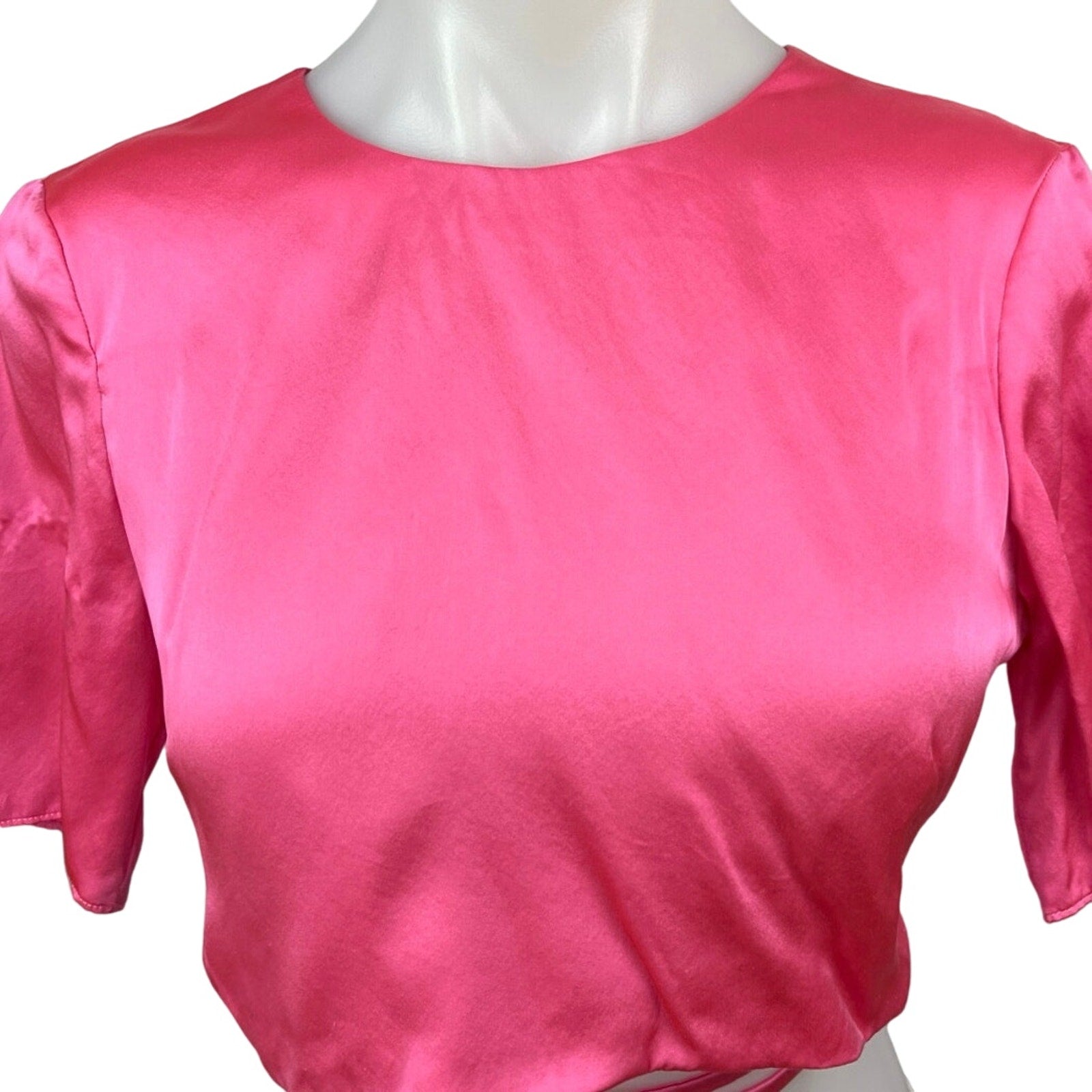 NEW Amanda Uprichard Andra Pink Ribbon 100% Silk Satin Short Sleeve Crop Top S