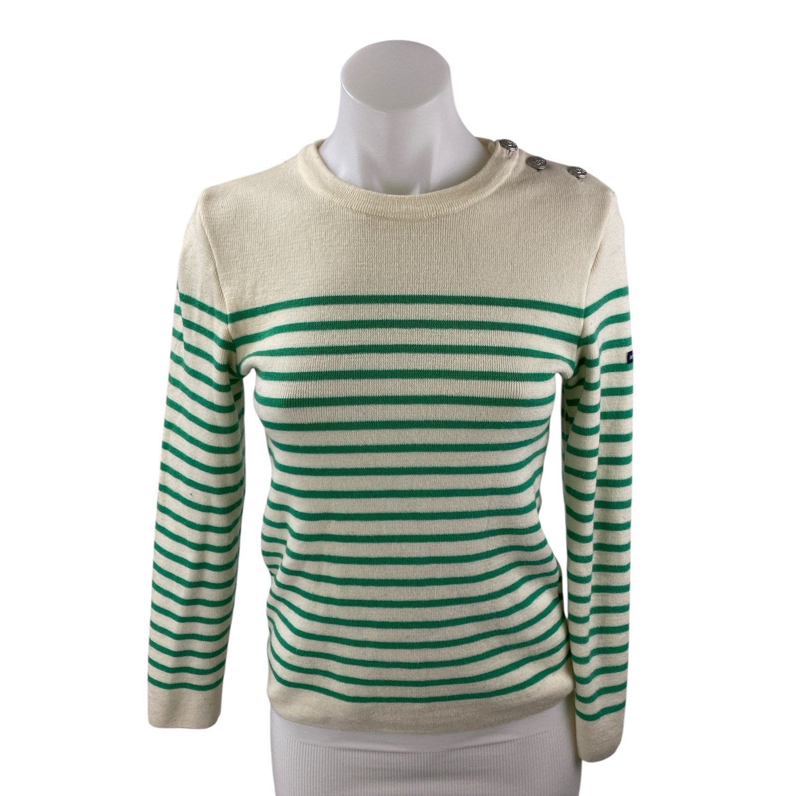 Saint James L'atelier Cream Green Striped Crew Neck Long Sleeve Sweatshirt Sweater Top Size S