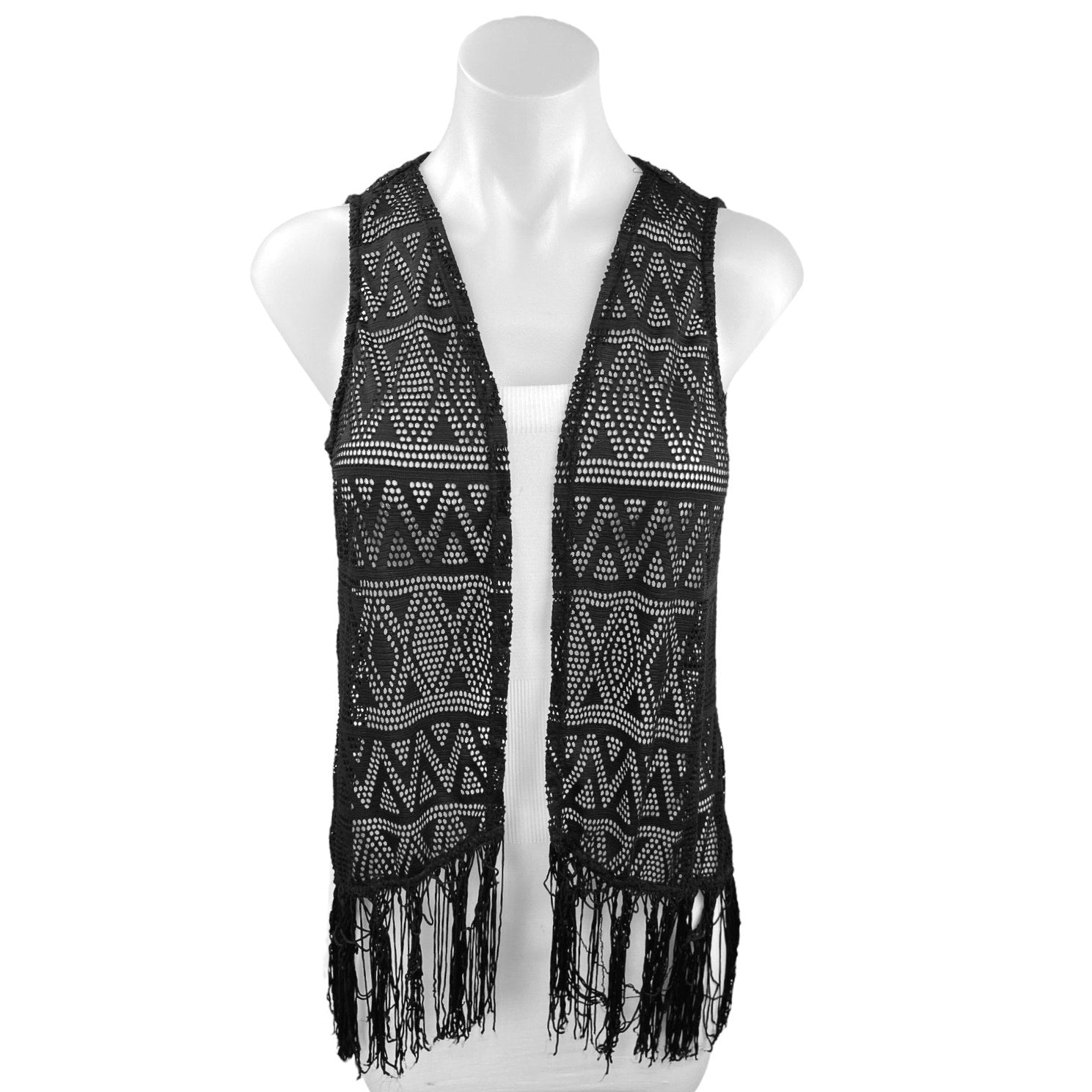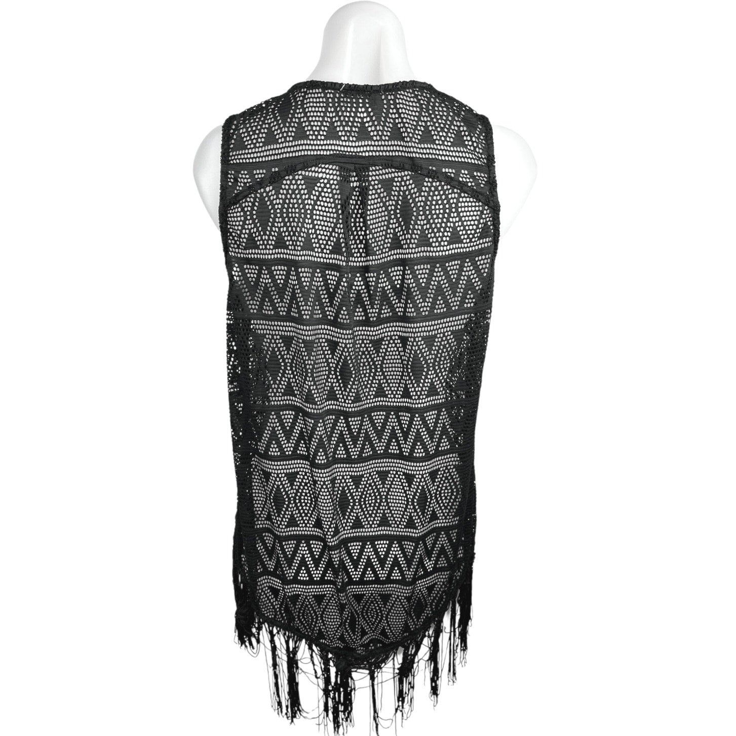 Tobi Black Boho Festival Coachella Argyle Fringe Eyelet Sleeveless Cardigan Vest Top Sz S