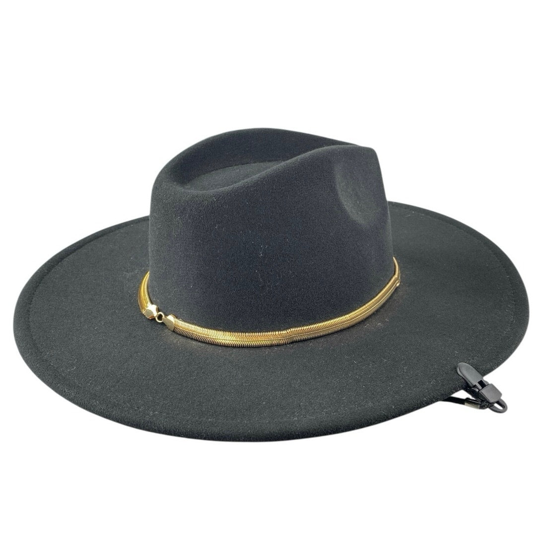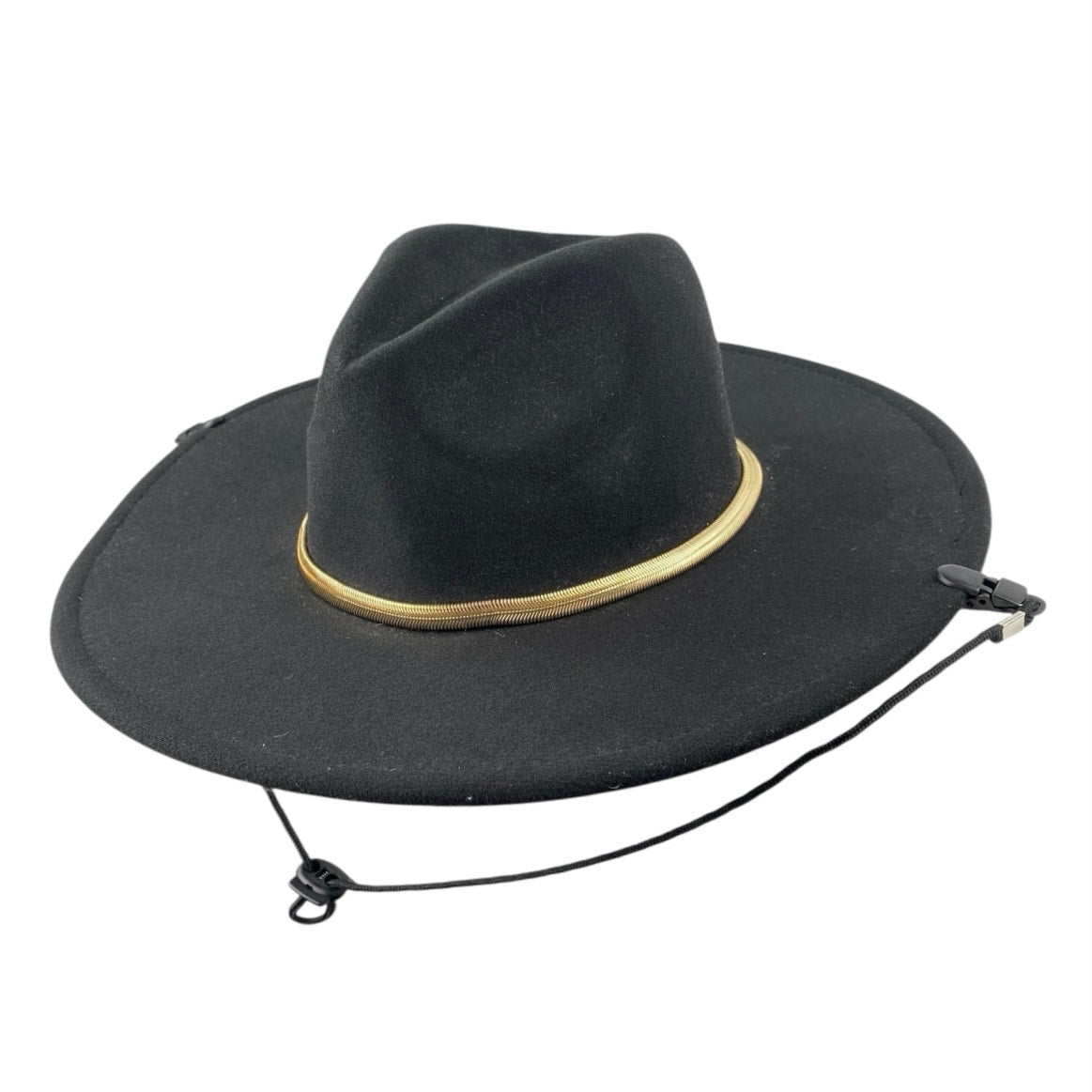 Women's Black Gold Chain Faux Suede Strap Panama Western Cowboy Hat On – Brie