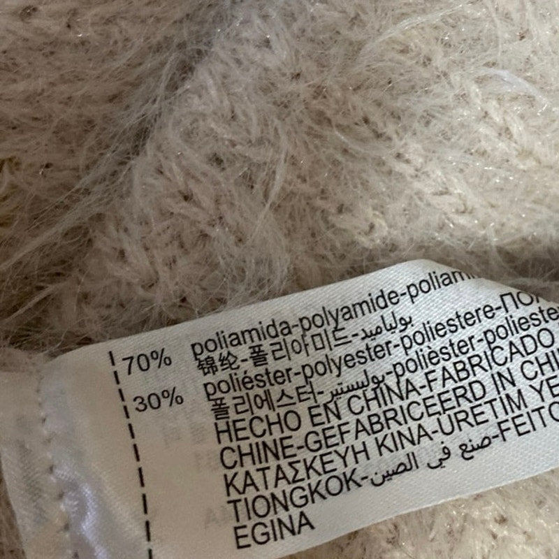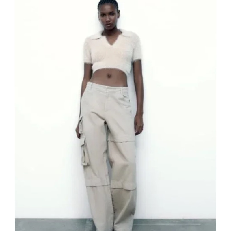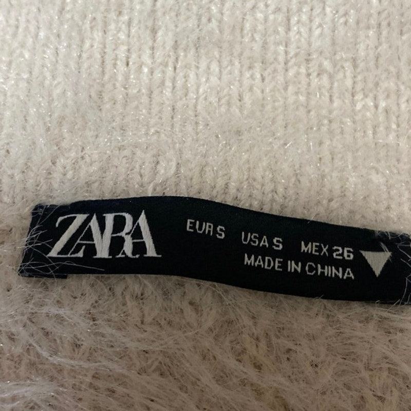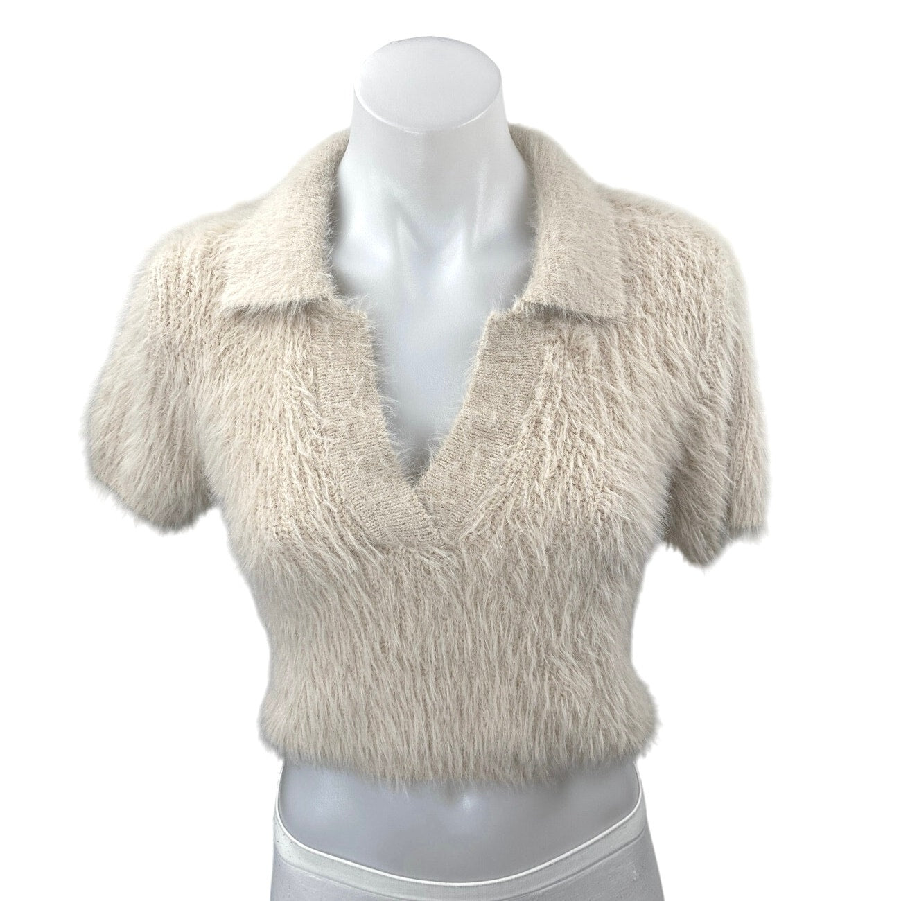 Zara Beige Short Sleeve Faux Fur V Neck Collared Polo Crop Sweater Top Size S