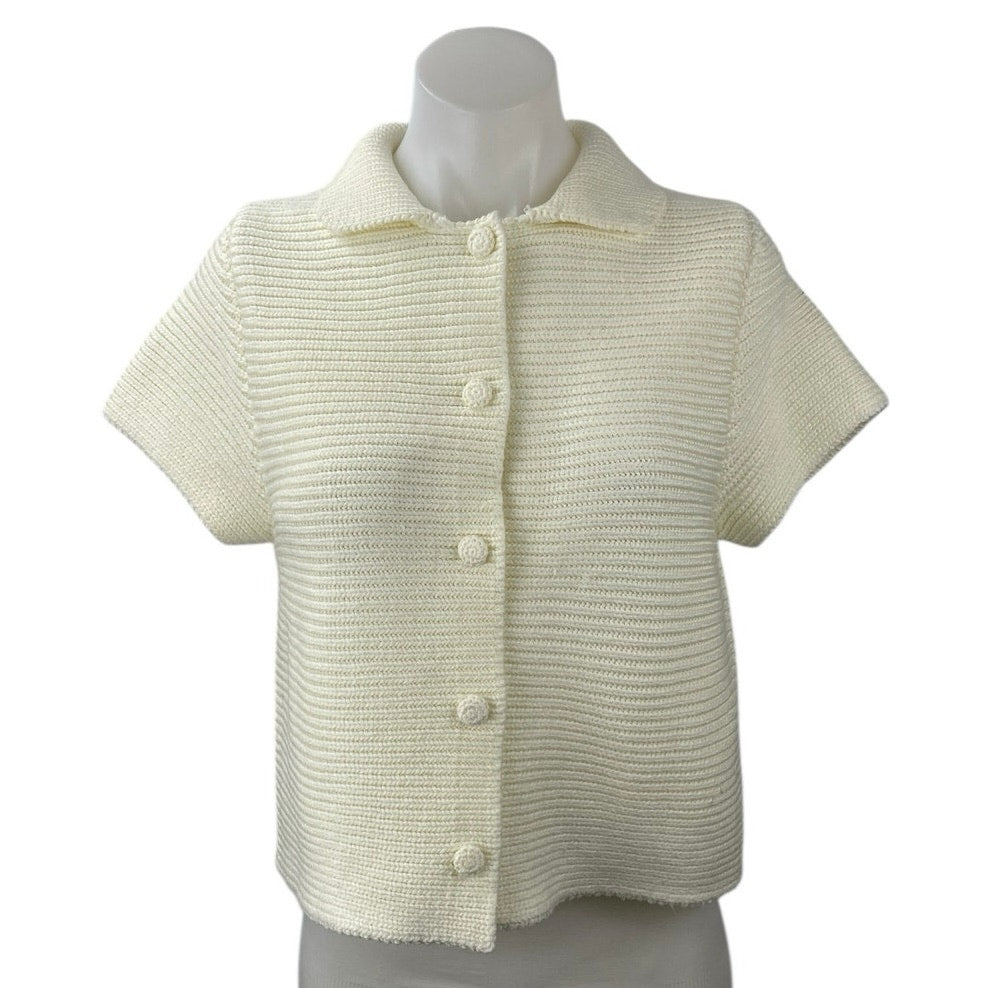 Zara Cream White Rib Knit Collar Short Sleeve Button Up Polo Sweater Top Size M