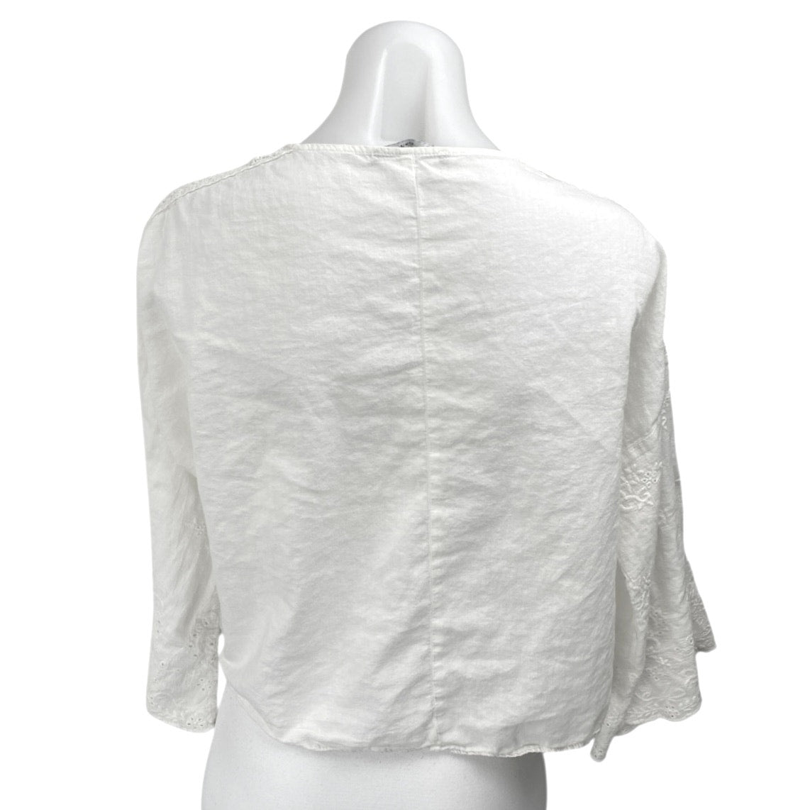 Zara White Floral Embroidered Eyelet Long Bell Sleeve Henley Shirt Blouse Top M