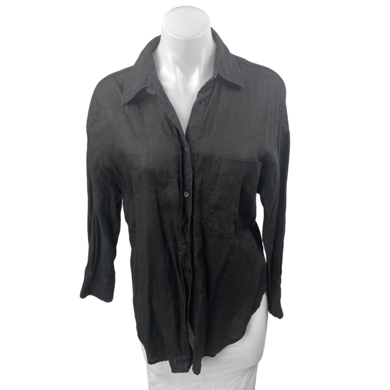 Zara Women's Black 100% Linen Long Sleeve V Neck Button Down Shirt Top Size L