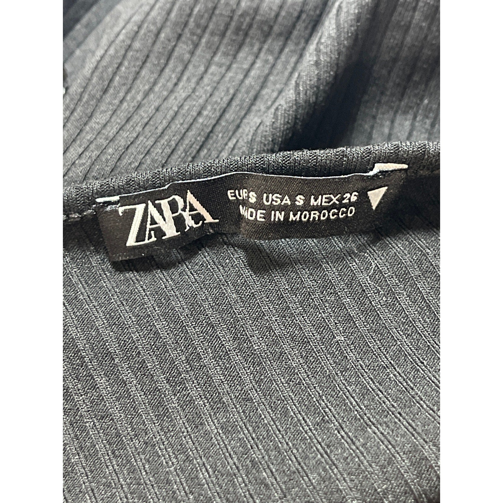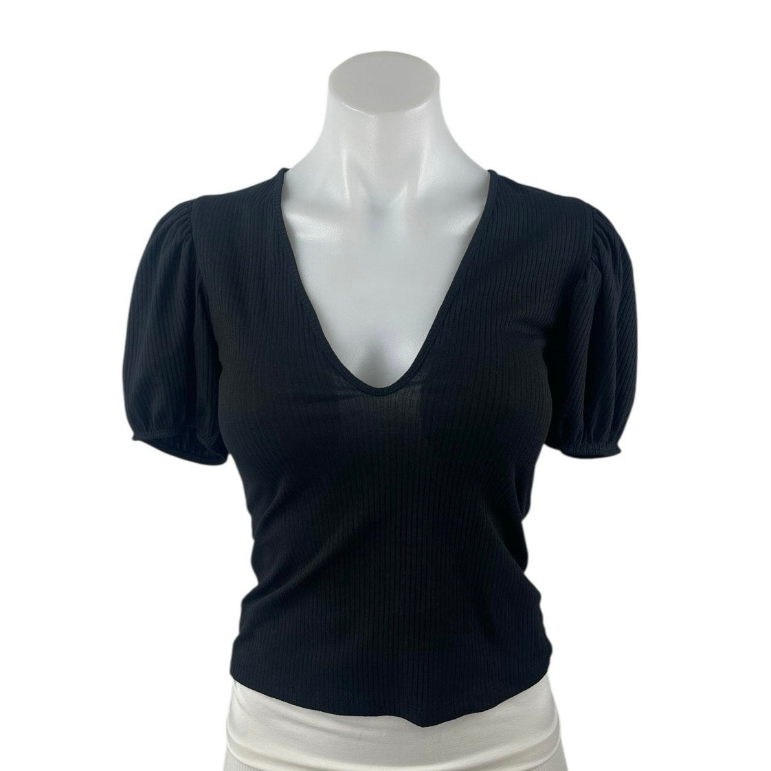Zara Women's Black Ribbed Knit V-neck Short Puff Sleeve Crop Blouse Top Size S