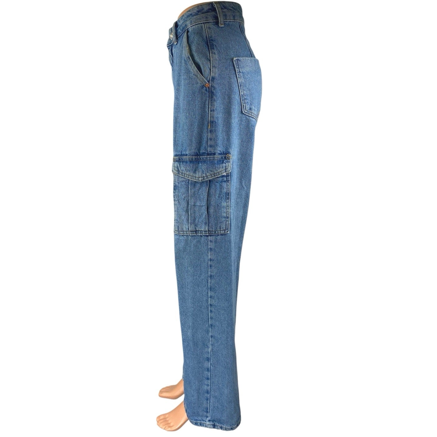 Zara Women's Blue High Waisted Straight Wide Leg Cargo Denim Jeans Pants Size 2