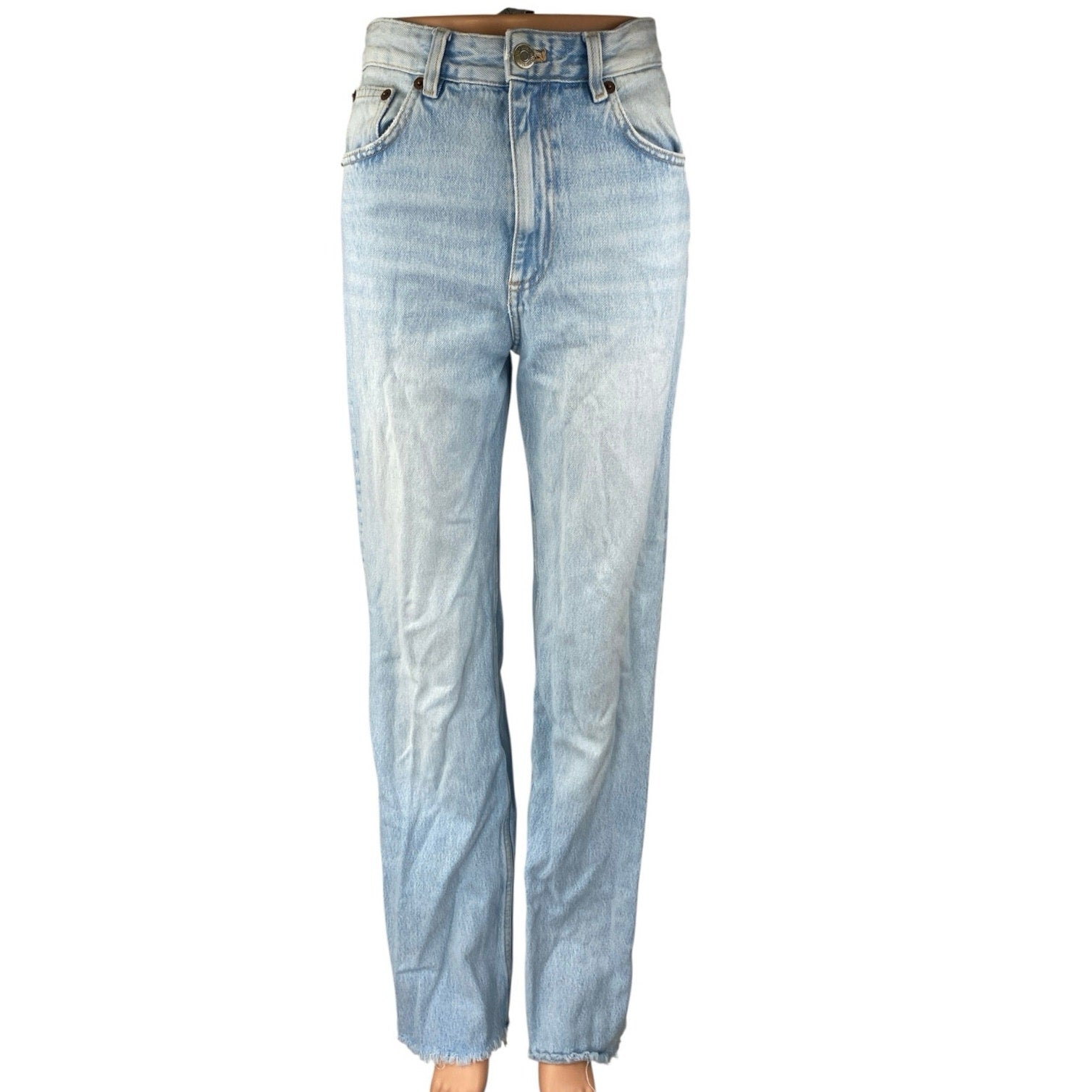 Zara Women's Blue Light Wash High Waisted Raw Hem Straight Denim Jeans Size 2