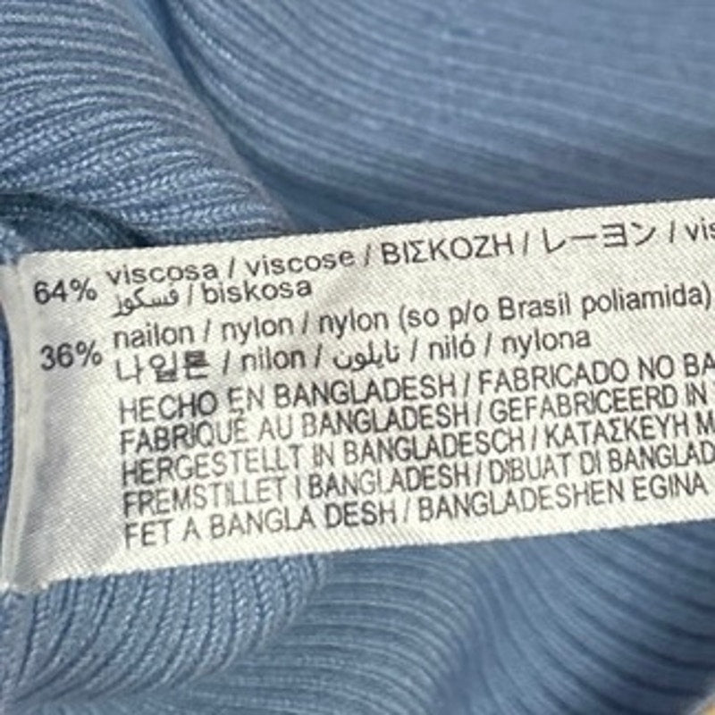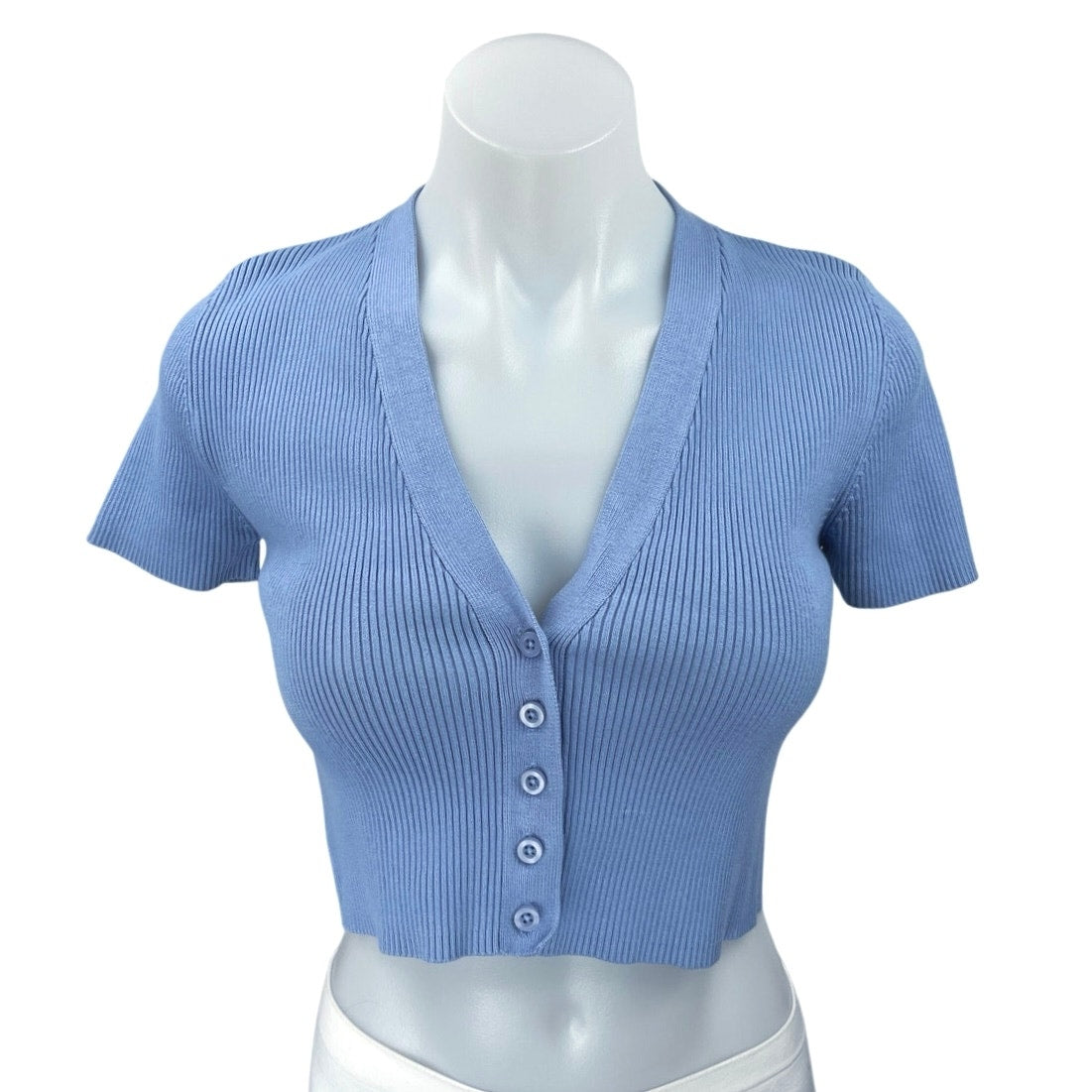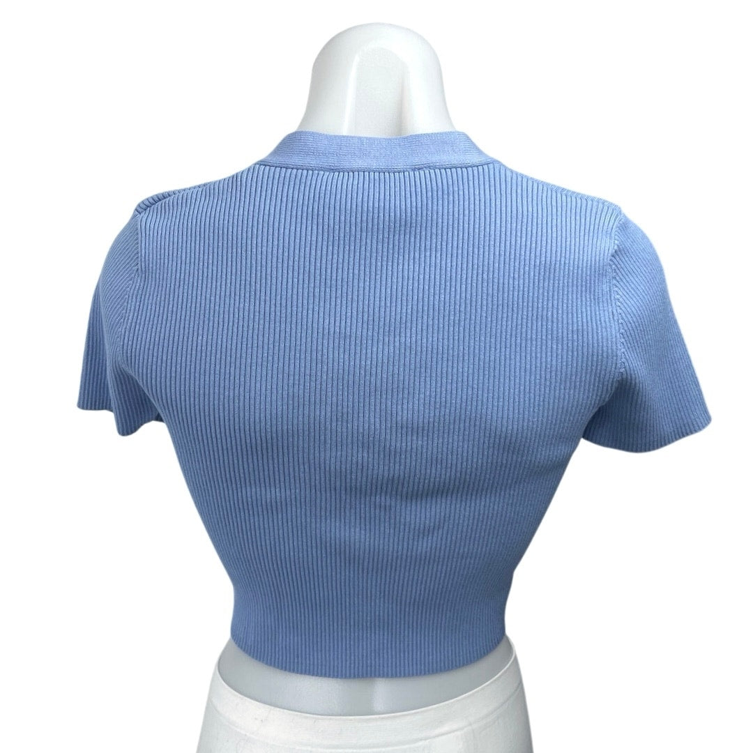 Zara Women's Blue Rib Knit Short Sleeve V-neck Button Crop Sweater Shirt Top Size M