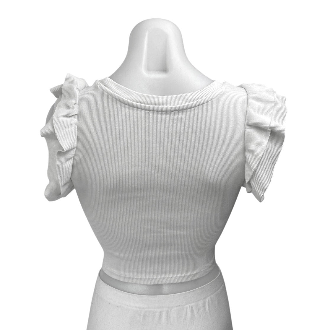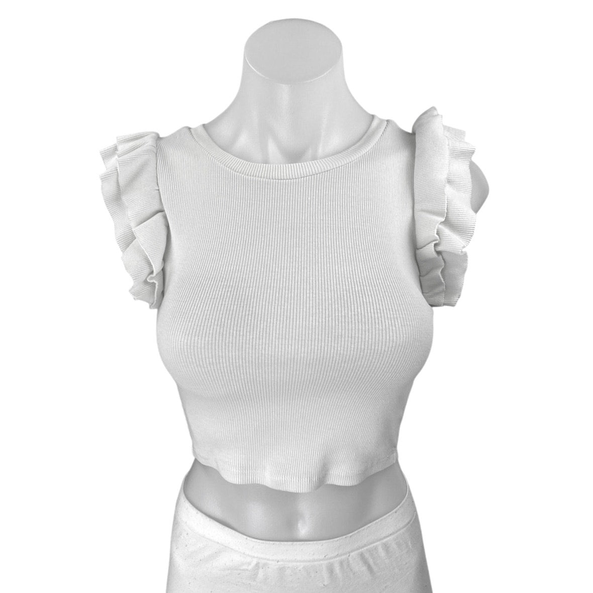 Zara Women's White Ruffle Sleeveless Ribbed Knit Blouse Crewneck Crop Top Size S