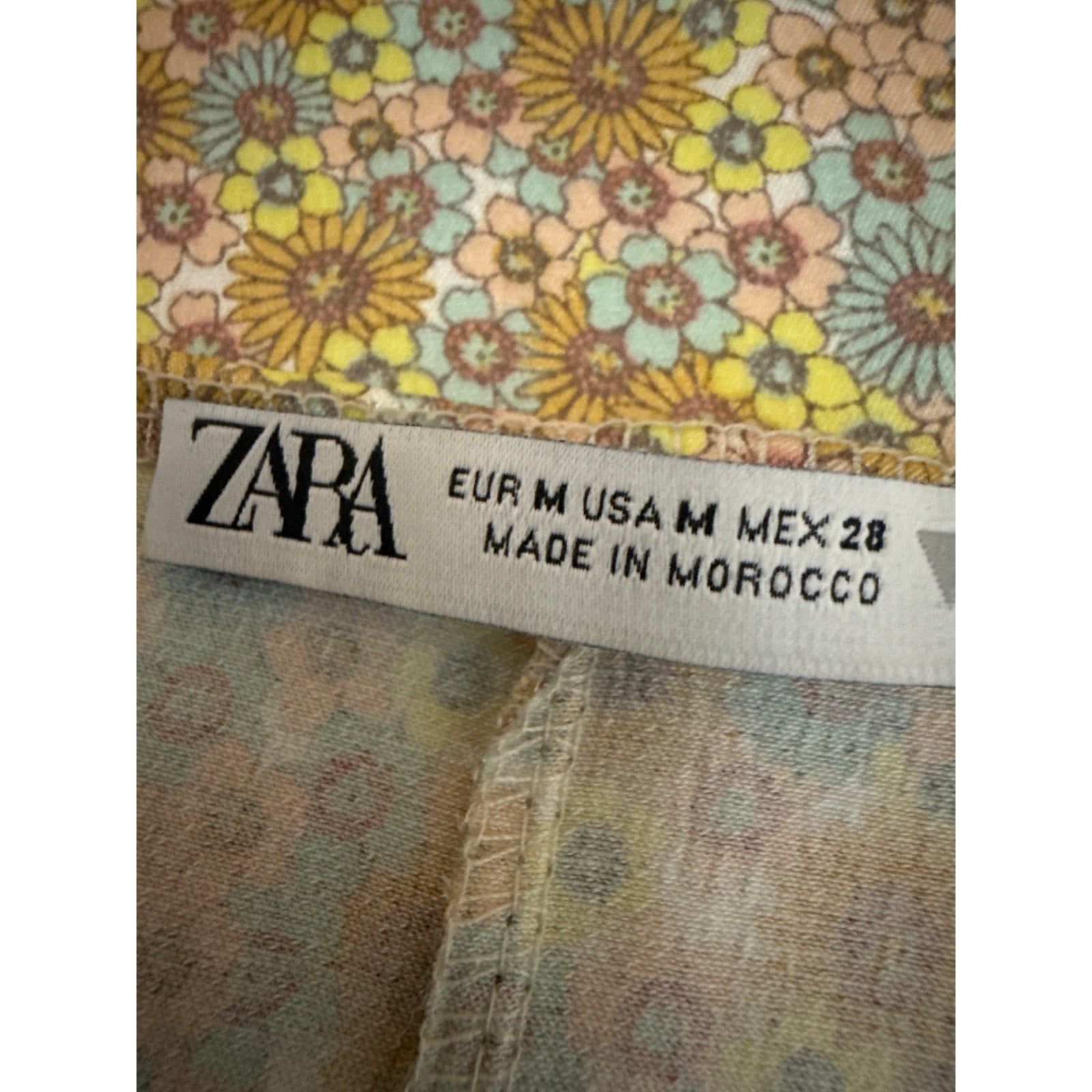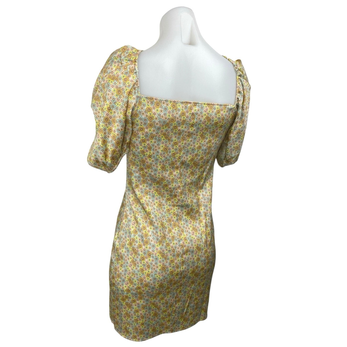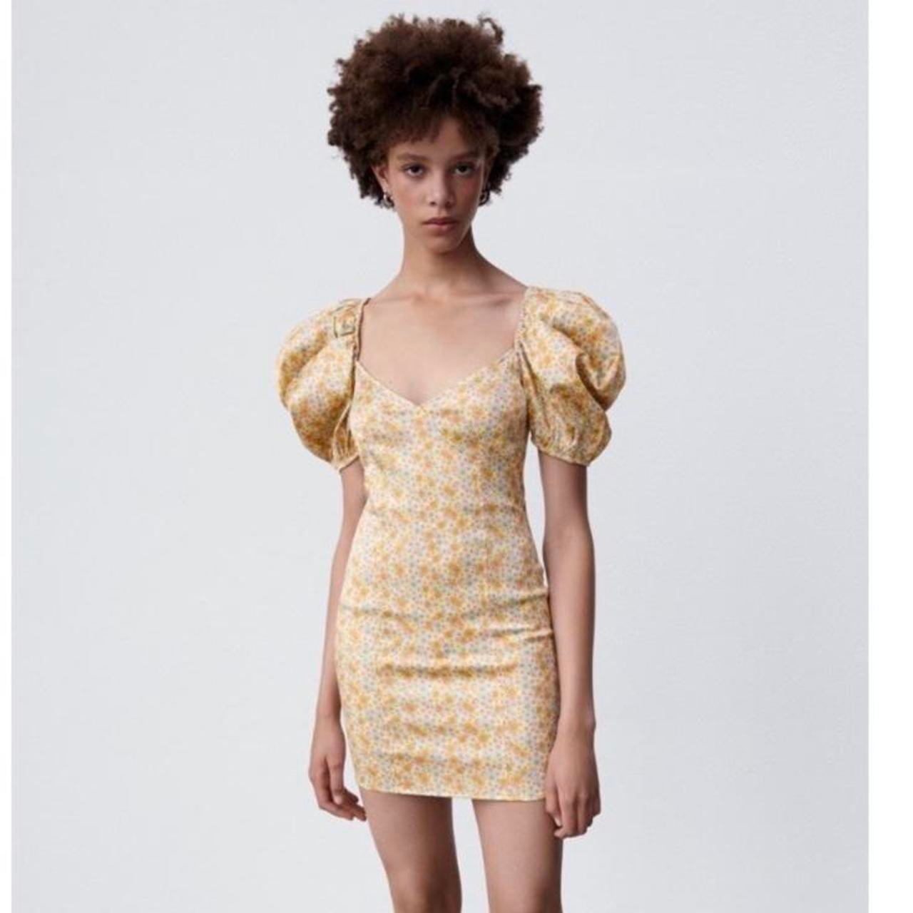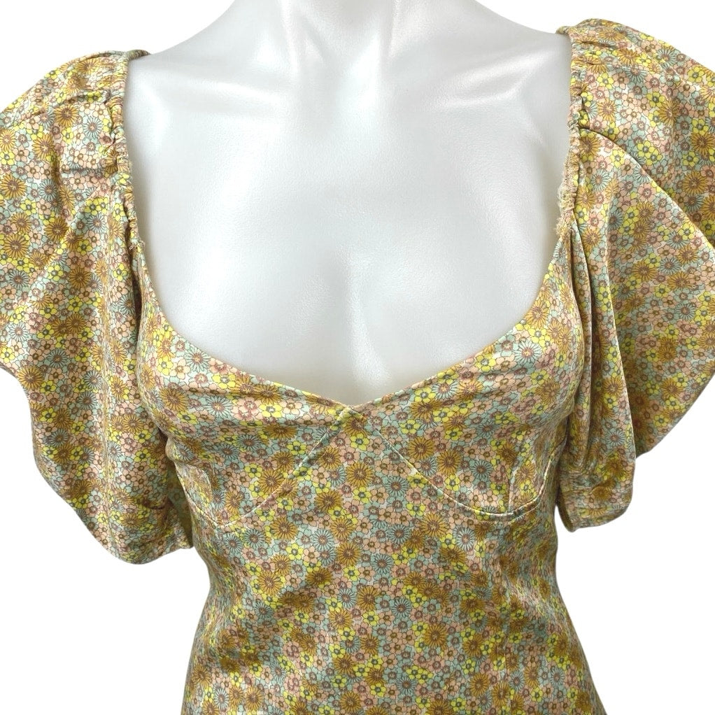 Zara Yellow Floral Silk Satin Short Puff Sleeve Bustier Mini Bodycon Dress Sz M