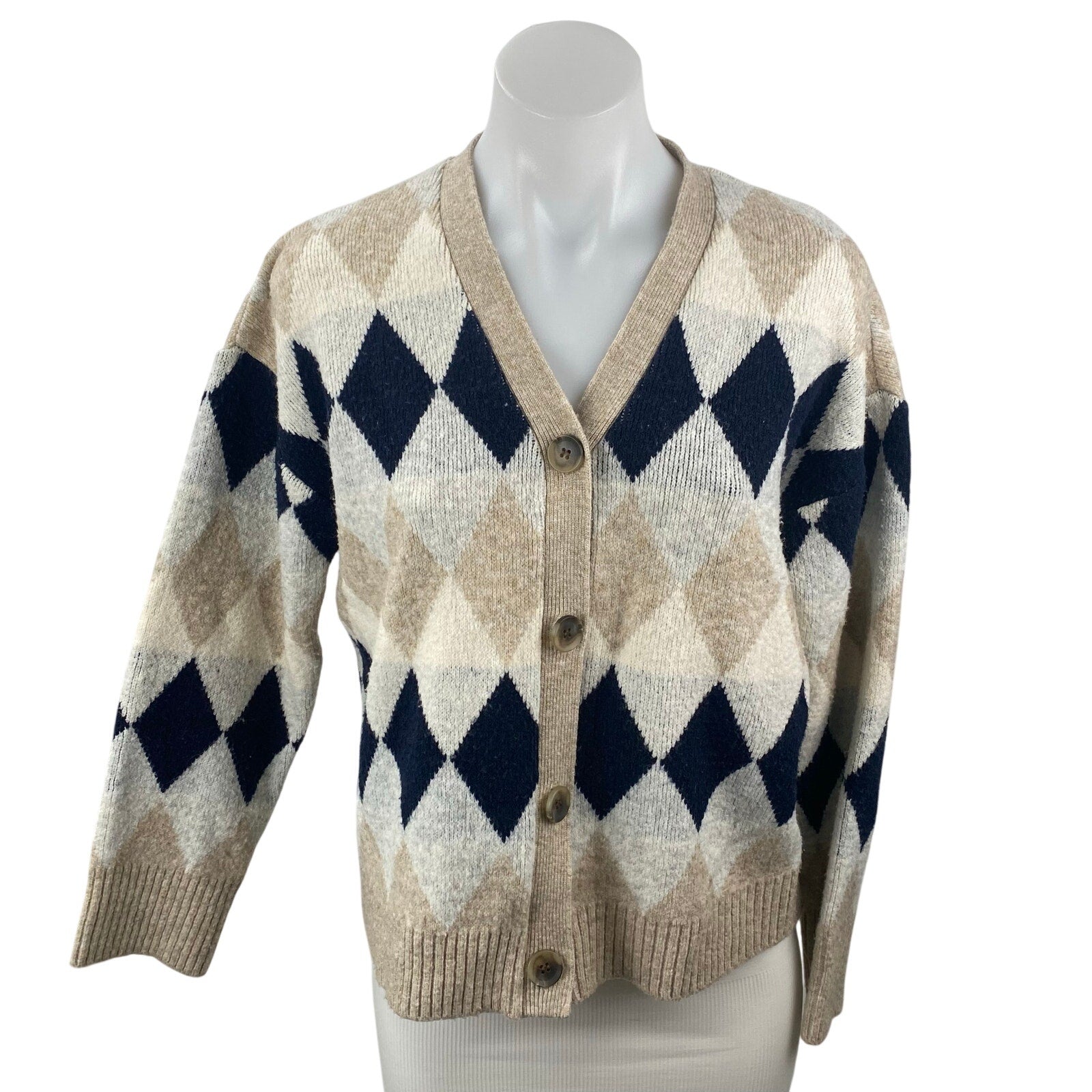 Zizae Women's Beige Argyle Diamond Long Sleeve Button Up Cardigan Sweater Size M
