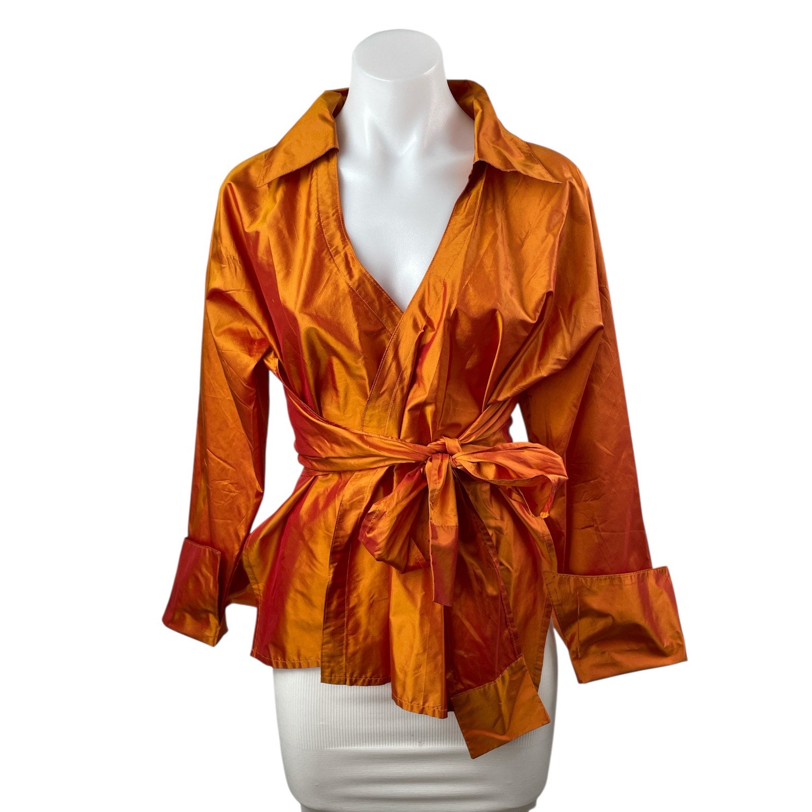 Zuzka Women's Rust Coral Silk Satin Long Sleeve Tie Waist Shirt Blouse Top OS